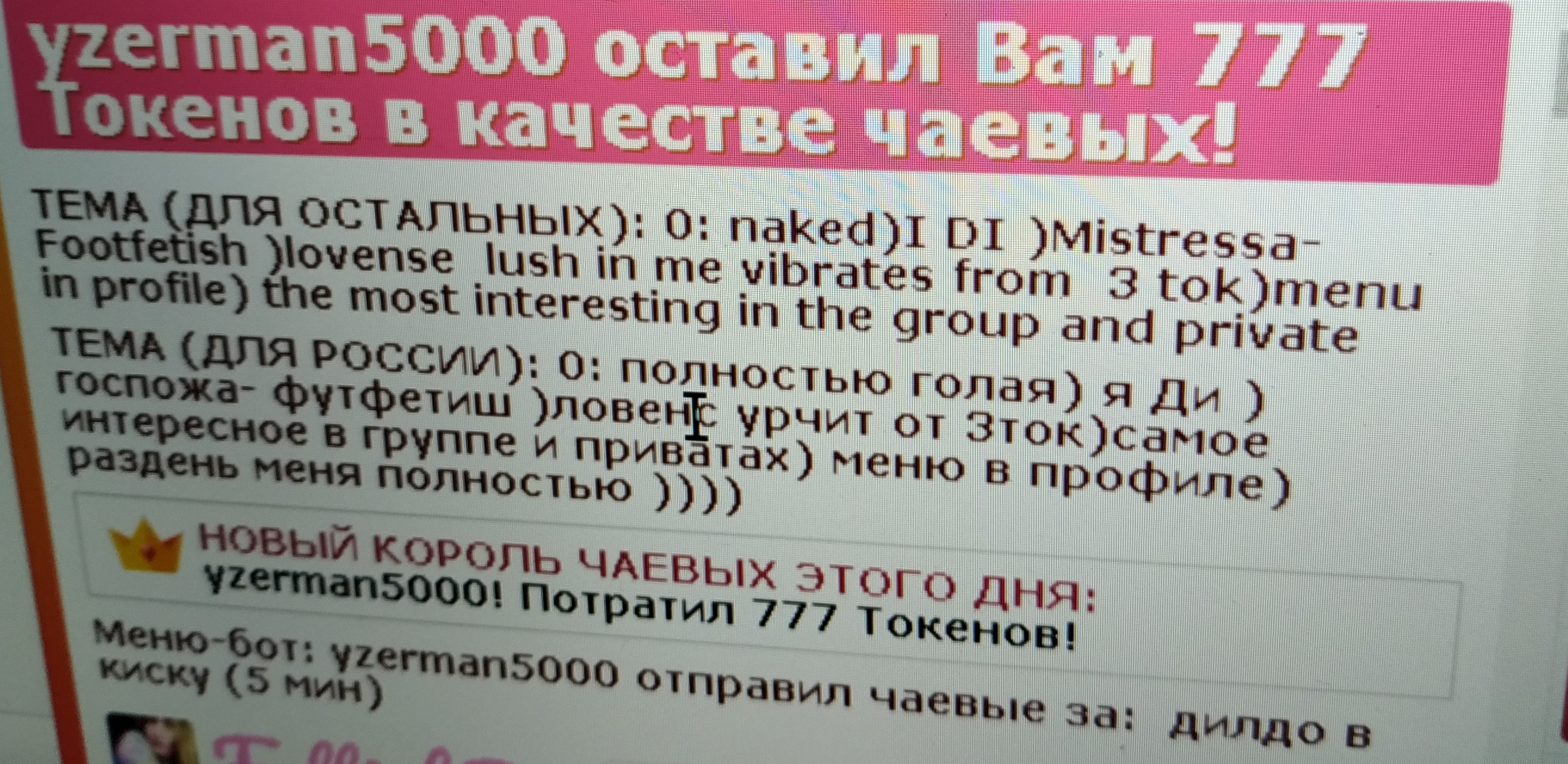 1: naked)I DI )Mistressa- Footfetish )lovense lush in me vibrates from 3 tok)menu in profile) the most interesting in the group and private